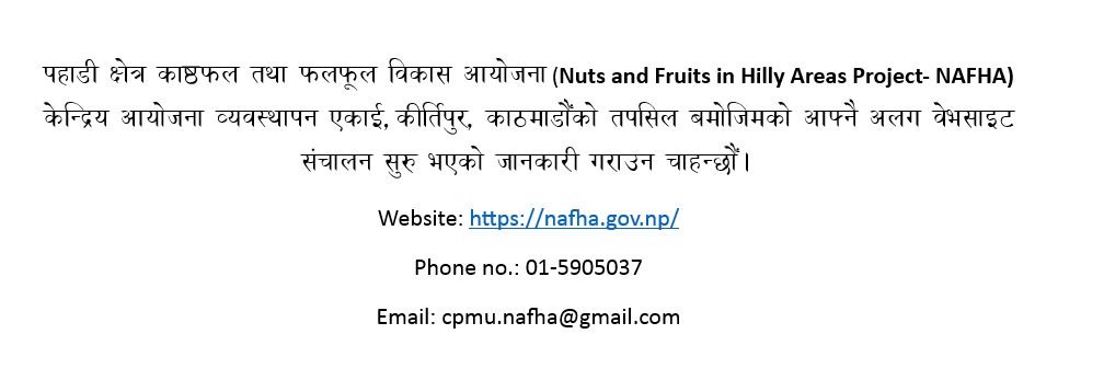 नेपाल सरकार कृषि तथा पशुपन्छी बिकास मन्त्रालय कृषि बिभाग राष्ट्रिय फलफूल बिकास केन्द्र कीर्तिपुर, काठमाडौँ फोन नं. ०१-५९०५७४२, ५९०५०५३ इमेल: ncfd.gov.np@gmail.com